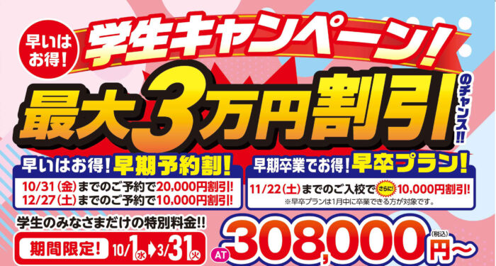 只今、10月31日(金)までのご予約と11月22日(土)までのご入校で最大3万円割引のチャンス!!
